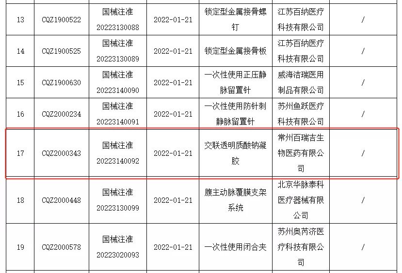 2022年1月26日,常州百瑞吉生物醫(yī)藥有限公司生產(chǎn)的產(chǎn)品“交聯(lián)透明質(zhì)酸鈉凝膠”獲NMPA批準(zhǔn)上市(國(guó)械注準(zhǔn)20223140092),產(chǎn)品用于預(yù)防盆腹腔術(shù)后粘連,恭喜百瑞吉產(chǎn)品獲得市場(chǎng)準(zhǔn)入。