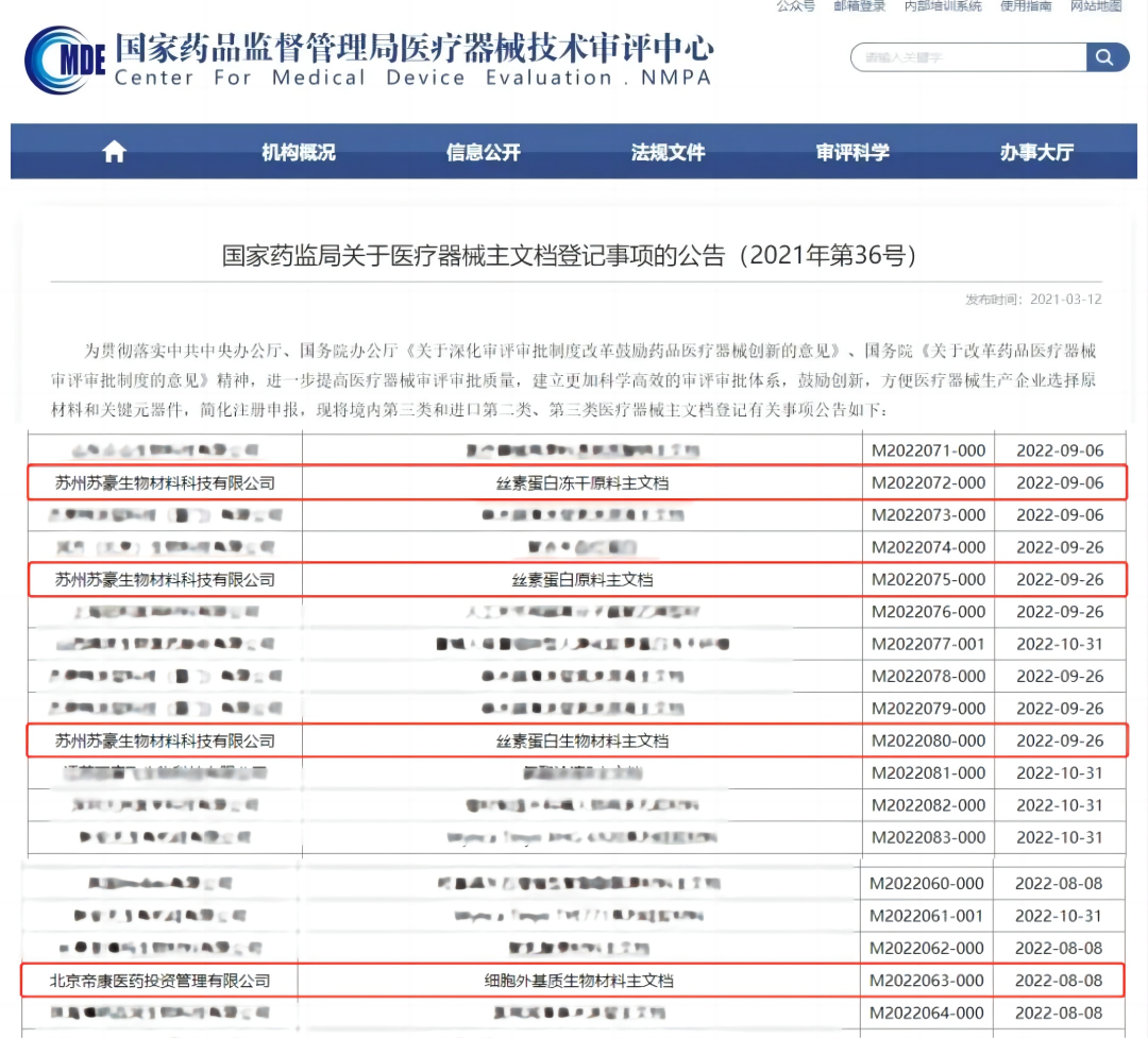 8月,CDMO中心四款醫(yī)療器械原材料通過主文檔登記備案(絲素蛋白凍干原料、絲素蛋白原料、絲素蛋白生物材料、細胞外基質(zhì)生物材料),主文檔備案的通過為醫(yī)藥行業(yè)細胞外基質(zhì)和絲素蛋白產(chǎn)品研發(fā)及生產(chǎn)提供了合法來源的原料,具有里程碑意義。