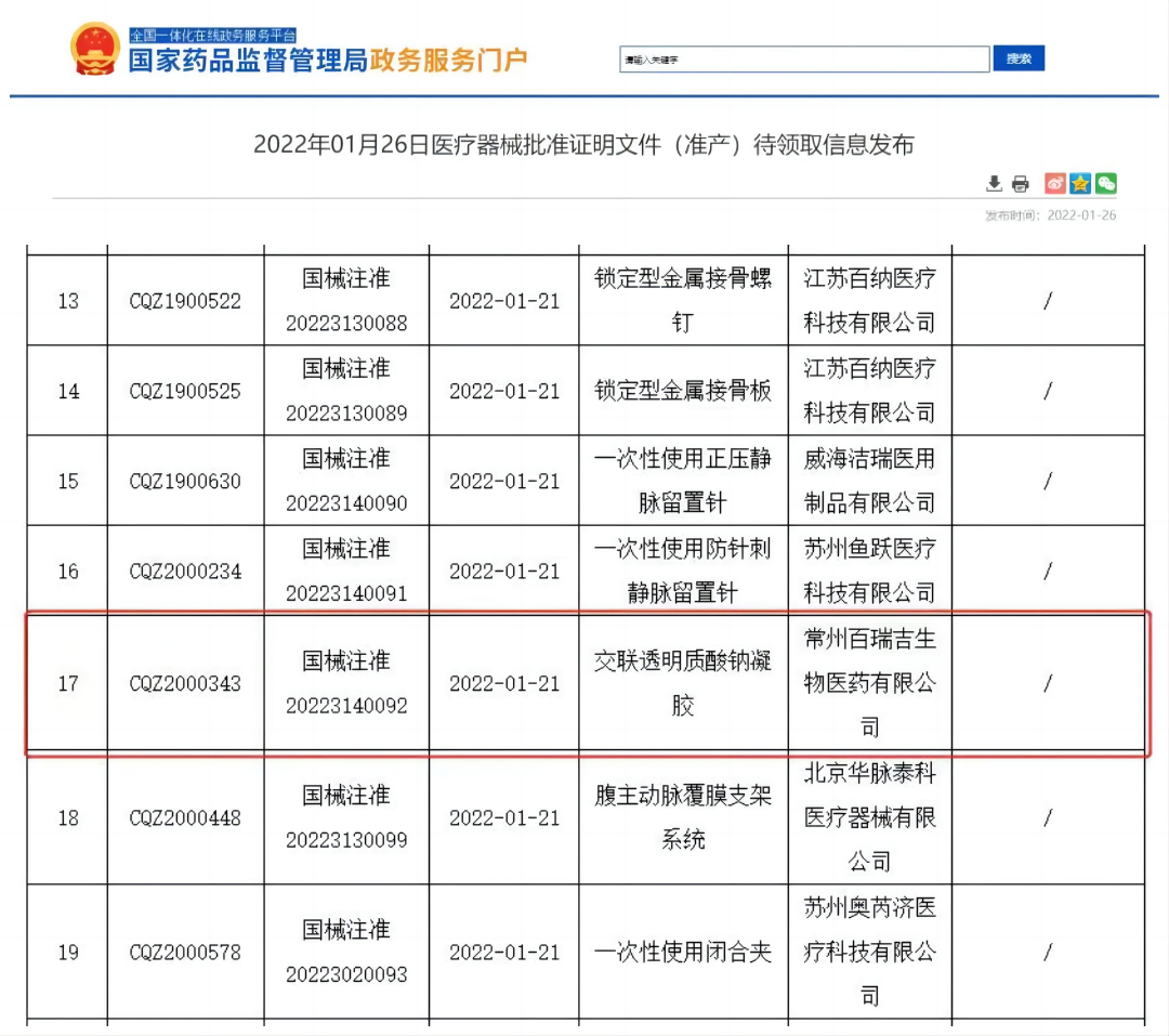 1月26日,常州百瑞吉生物醫(yī)藥有限公司生產(chǎn)的“交聯(lián)透明質(zhì)酸鈉凝膠”獲國家藥監(jiān)局批準上市,產(chǎn)品用于預防盆腹腔術(shù)后粘連,奧泰康助力產(chǎn)品獲得市場準入。