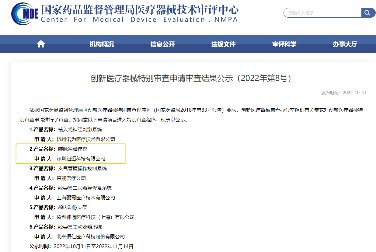 10月31日,深圳鈕邁科技研發(fā)的創(chuàng)新醫(yī)療器械“陡脈沖治療儀”進入特別審查程序,奧泰康提供創(chuàng)新申報和臨床試驗服務,系第18項創(chuàng)新產(chǎn)品臨床服務。