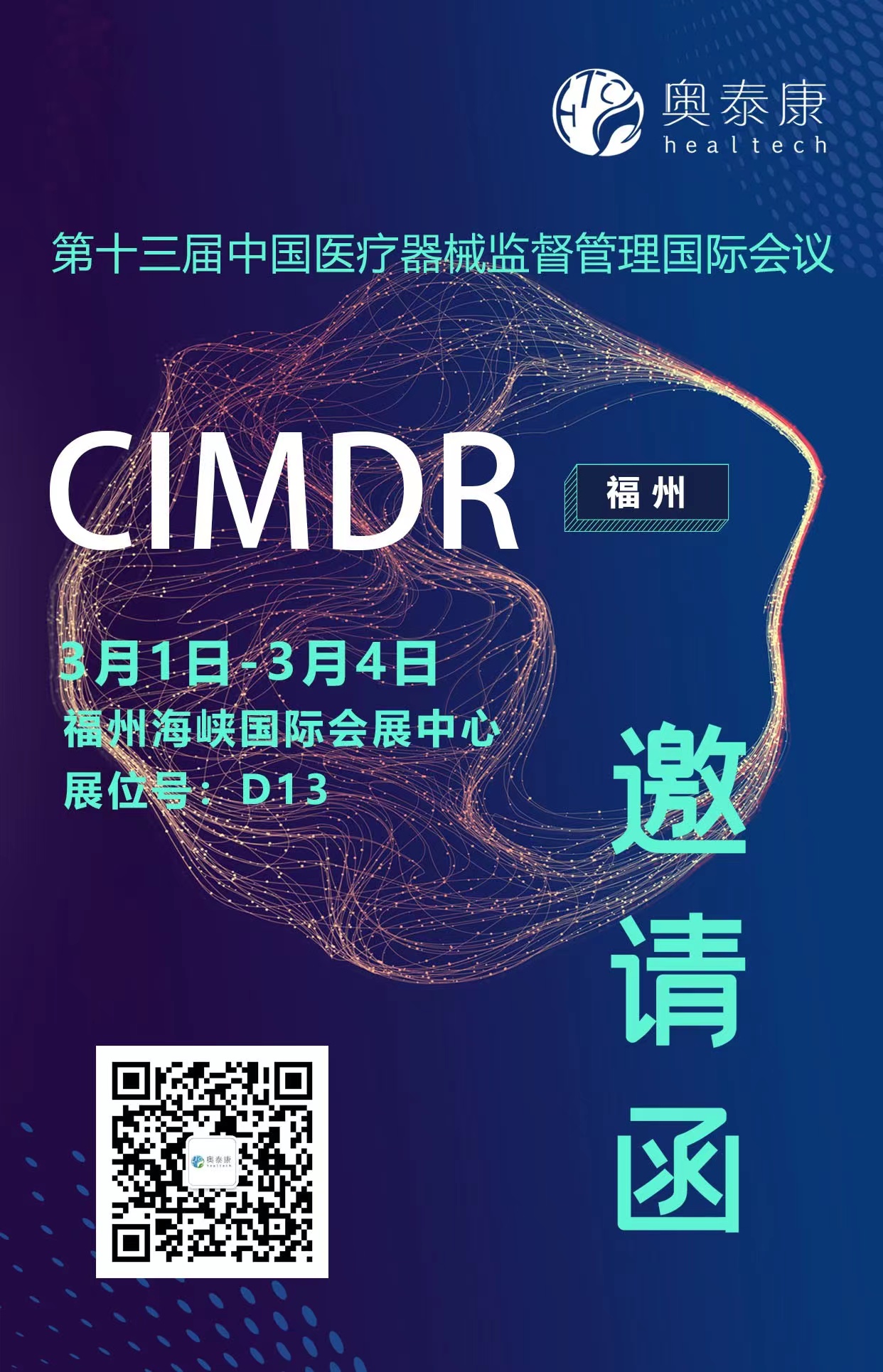 2023年3月1日-4日,第十三屆中國醫(yī)療器械監(jiān)督管理國際會(huì)議(CIMDR)將于福建省福州市海峽國際會(huì)展中心隆重舉行,奧泰康作為參展商和演講嘉賓參加會(huì)議,誠摯邀請各位醫(yī)療同仁蒞臨展位。