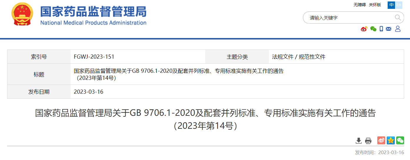 關(guān)于GB 9706.1-2020及配套并列標(biāo)準(zhǔn)、專用標(biāo)準(zhǔn)實施有關(guān)工作的通告(2023年第14號)及解讀