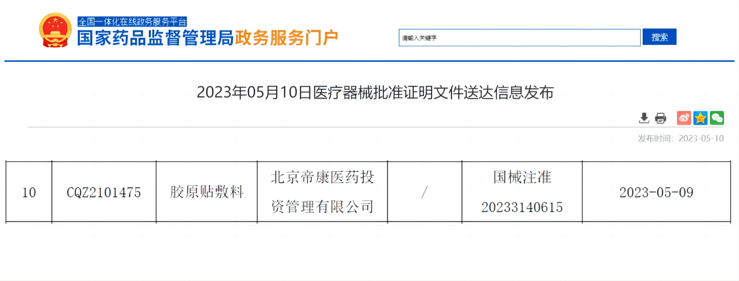 2023年5月9日,奧泰康北京CDMO中心取得「首張」國(guó)家藥監(jiān)局批準(zhǔn)的三類醫(yī)療器械注冊(cè)證(國(guó)械注準(zhǔn)20233140615),系全國(guó)首個(gè)以細(xì)胞外基質(zhì)來源的膠原蛋白為原料制備的三類膠原貼敷料。此項(xiàng)目是北京CDMO中心基于“十三五”國(guó)家重點(diǎn)研發(fā)計(jì)劃項(xiàng)目,在MAH制度下,與湖北恒安芙林藥業(yè)股份有限公司戰(zhàn)略合作完成涵蓋市場(chǎng)準(zhǔn)入全流程業(yè)務(wù)的醫(yī)美類項(xiàng)目,也是器械CRO/CDMO行業(yè)受托研發(fā)誕生的全國(guó)首個(gè)三類醫(yī)療器械注冊(cè)證,具有里程碑意義。