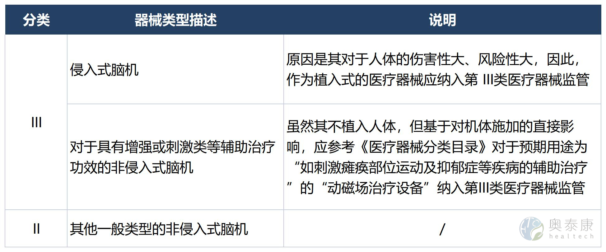 腦機接口技術(shù)需要大規(guī)模的臨床試驗和更加嚴(yán)謹(jǐn)?shù)囊?guī)范來推動其順利落地應(yīng)用,依據(jù)影響醫(yī)療器械風(fēng)險程度的因素、風(fēng)險程度高低兩類判斷標(biāo)準(zhǔn),目前,腦機接口臨床試驗規(guī)范還需要更加完善和細(xì)化,例如腦機接口臨床準(zhǔn)入細(xì)則、數(shù)據(jù)采集、處理、分析以及治療效果評估等等方面的指導(dǎo),以確保在腦機接口產(chǎn)品的開發(fā)和推廣過程中不會出現(xiàn)安全隱患。《醫(yī)療器械分類目錄》規(guī)定腦機接口設(shè)備的分類監(jiān)管要求如下:
