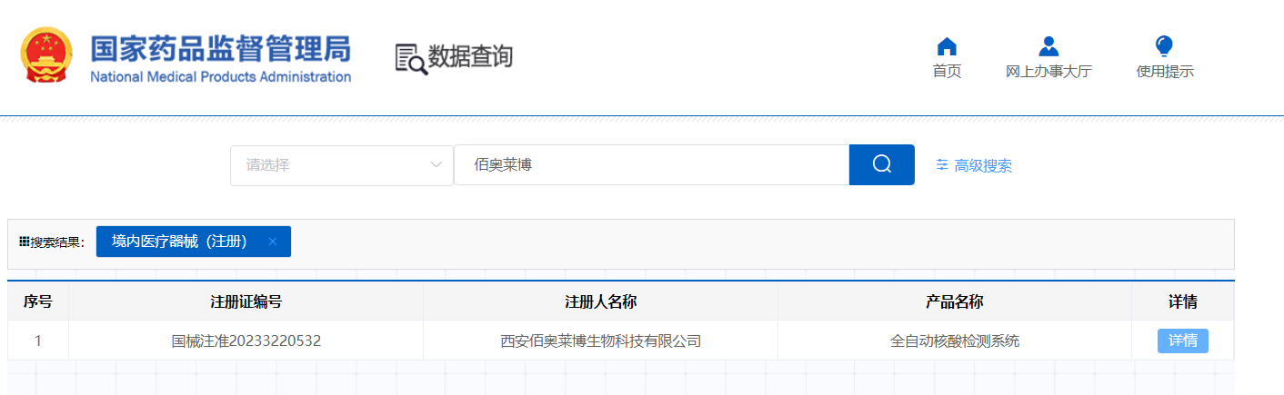2023年4月24日,經(jīng)國家藥品監(jiān)督管理局公示,西安佰奧萊博生物科技有限公司的“全自動核酸檢測系統(tǒng)”(國械注準20233220532)獲得NMPA批準上市,系2023年奧泰康助力獲得的第10張三類醫(yī)療器械注冊證。