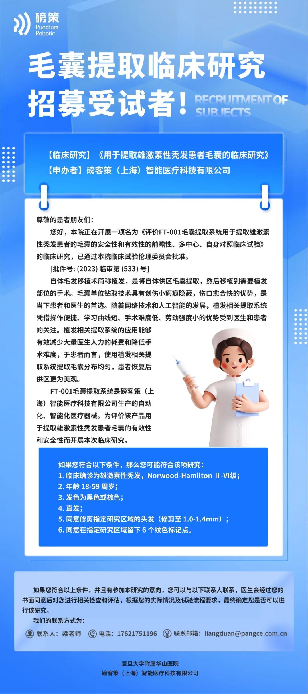近期,由磅客策 (上海)智能醫(yī)療科技有限公司研發(fā)的磅策植發(fā)機(jī)器人在上海成功召開臨床試驗(yàn)啟動會暨人工智能毛發(fā)創(chuàng)新中心落成典禮,奧泰康負(fù)責(zé)臨床試驗(yàn)服務(wù)。