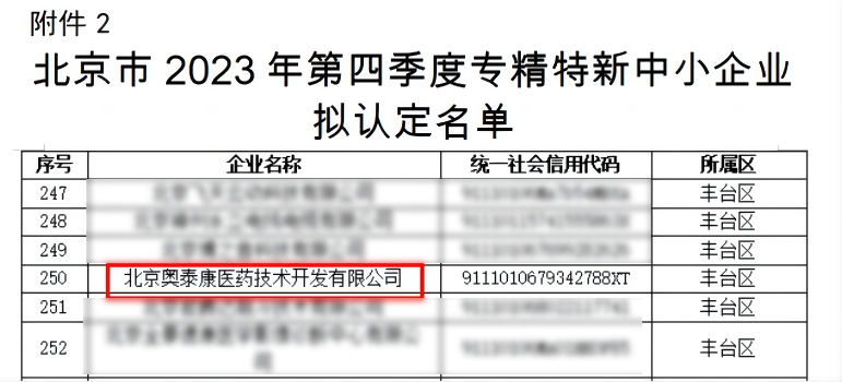 2024年1月30日,北京市經(jīng)濟(jì)和信息化局發(fā)布通知公告《關(guān)于對(duì)北京市2023年度第四季度專精特新中小企業(yè)名單進(jìn)行公示的通知》,北京奧泰康醫(yī)藥技術(shù)開發(fā)有限公司成功被認(rèn)定為北京市“專精特新”中小企業(yè),這也是奧泰康繼國(guó)家高新技術(shù)企業(yè)、中關(guān)村高新技術(shù)企業(yè)、全國(guó)科技型中小企業(yè)、北京市創(chuàng)新型中小企業(yè)之后,獲得的又一項(xiàng)重要資質(zhì)。