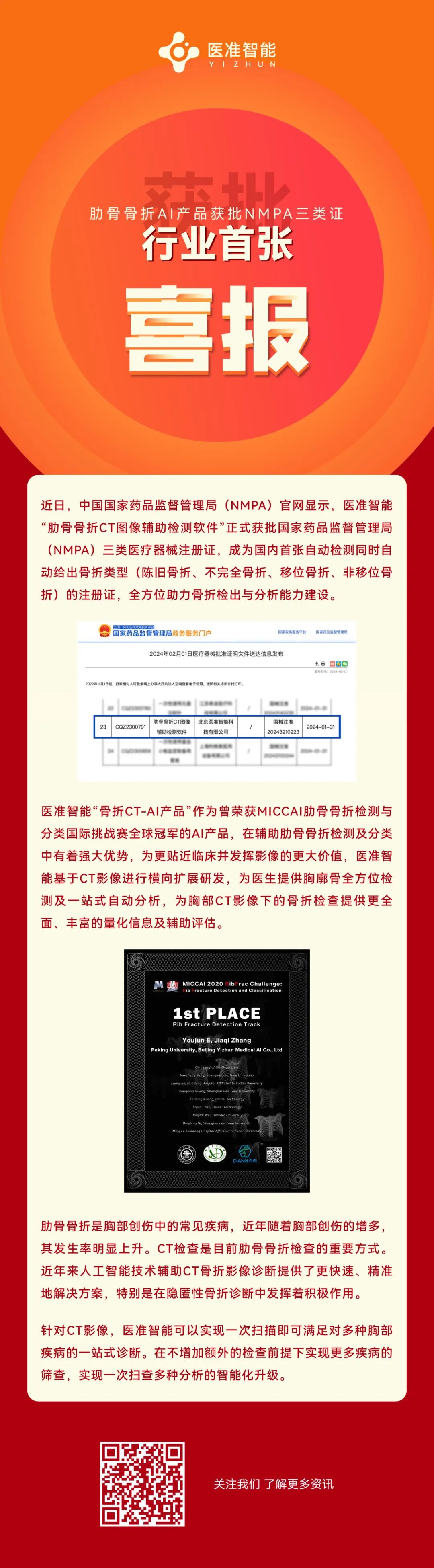 2024年1月31日,經(jīng)國(guó)家藥品監(jiān)督管理局公示,北京醫(yī)準(zhǔn)智能科技有限公司的肋骨骨折CT圖像輔助檢測(cè)軟件(國(guó)械注準(zhǔn)20243210223)獲得NMPA批準(zhǔn)上市,奧泰康承擔(dān)本項(xiàng)目部分臨床試驗(yàn)工作,系2024年奧泰康助力獲得的第二張三類醫(yī)療器械注冊(cè)證。