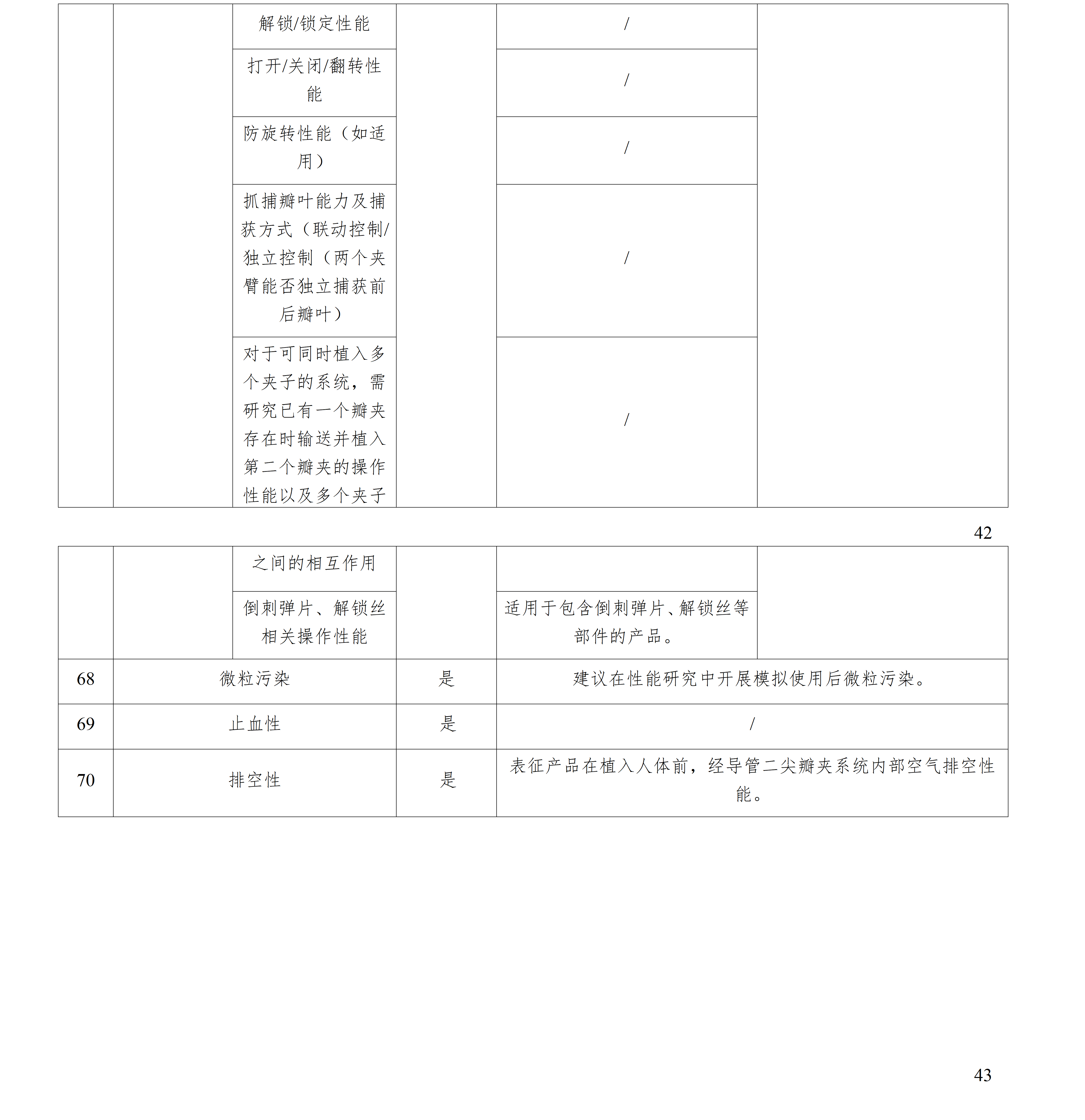 對于經(jīng)導(dǎo)管二尖瓣夾系統(tǒng),性能研究項目包括但不限于附表1所列項目。申請人應(yīng)根據(jù)具體產(chǎn)品特性,考慮應(yīng)增加的性能研究項目,對于附表1列舉的項目中,如不適用,亦應(yīng)提供合理性理由及依據(jù)。