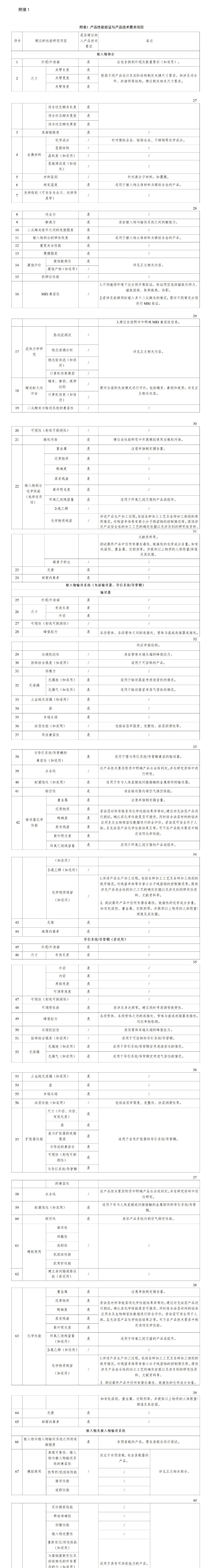 產(chǎn)品技術(shù)要求性能指標(biāo)可參考表1制定,如有不適用條款,申請人應(yīng)在申報資料中說明理由。如產(chǎn)品有特定設(shè)計,申請人還應(yīng)根據(jù)產(chǎn)品設(shè)計特征設(shè)定相應(yīng)的性能指標(biāo),并將其列入產(chǎn)品技術(shù)要求。若有隨產(chǎn)品一起申報的附件,無論附件是否已取得醫(yī)療器械注冊證,均應(yīng)將附件的性能指標(biāo)制定在產(chǎn)品技術(shù)要求中。對于可進行客觀判定的成品定性或定量的功能性、安全性指標(biāo),應(yīng)將其列入產(chǎn)品技術(shù)要求。