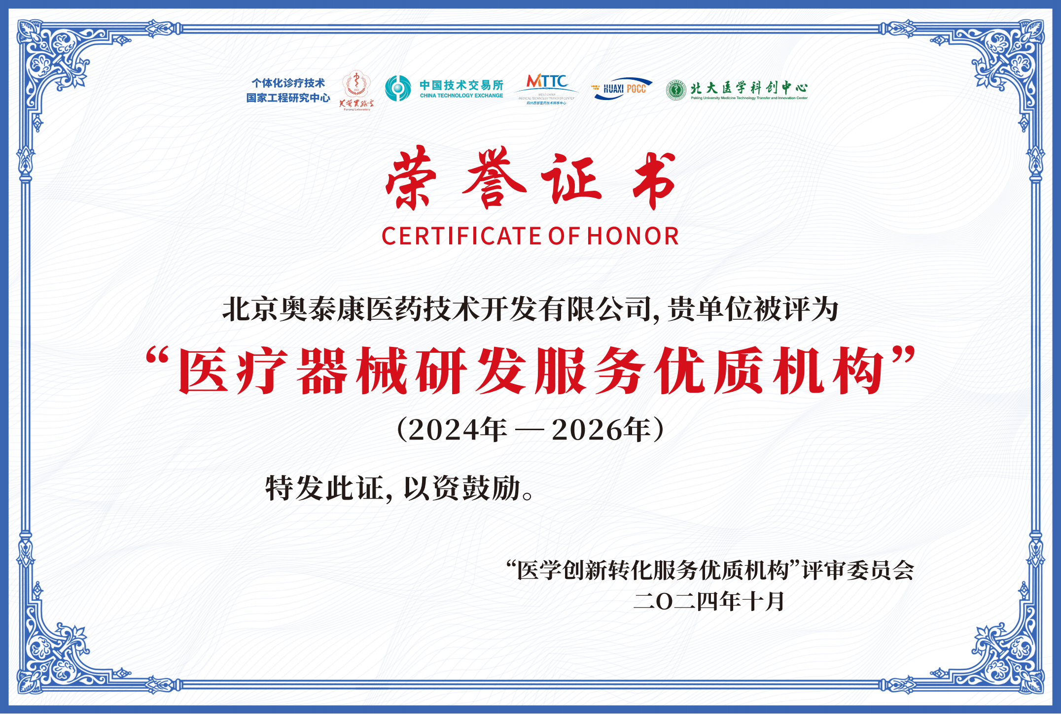 2024年10月14日,由中南大學(xué)、個體化診療技術(shù)國家工程研究中心、芙蓉實驗室等單位聯(lián)合主辦的個體化醫(yī)學(xué)研討會暨第四屆衛(wèi)生健康創(chuàng)新與轉(zhuǎn)化管理論壇于海南落幕,會議聚集來自全國各地的專家學(xué)者、相關(guān)政府部門、醫(yī)療衛(wèi)生健康領(lǐng)域高校、科研院所、醫(yī)院、醫(yī)療健康大數(shù)據(jù)相關(guān)產(chǎn)業(yè)代表400余人參會。奧泰康應(yīng)邀參加大會,并獲評2024年度“醫(yī)療器械研發(fā)服務(wù)優(yōu)質(zhì)機構(gòu)”。